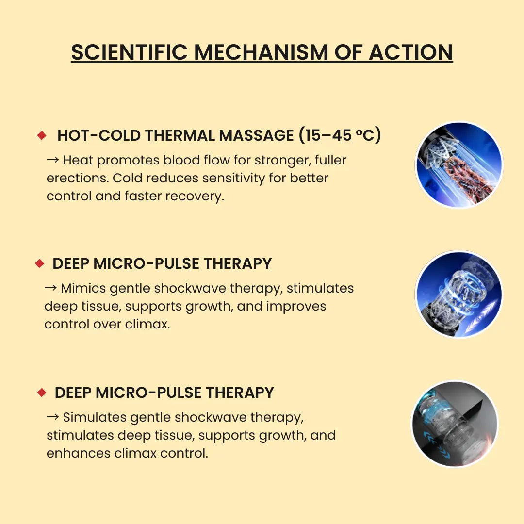 Alternate between heat and cold therapy during use to stimulate vascular response, support recovery, and enhance climax control.